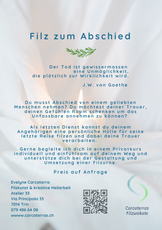 In diesem Workshop erschaffst du unter meiner Anleitung eine individuelle Filzhülle- ein einzigartiges, persönliches Kunstwerk, das deine Gedanken und Gefühle zur Endlichkeit widerspiegelt. Der kreative Prozess bietet Raum für Reflexion und Transformation.